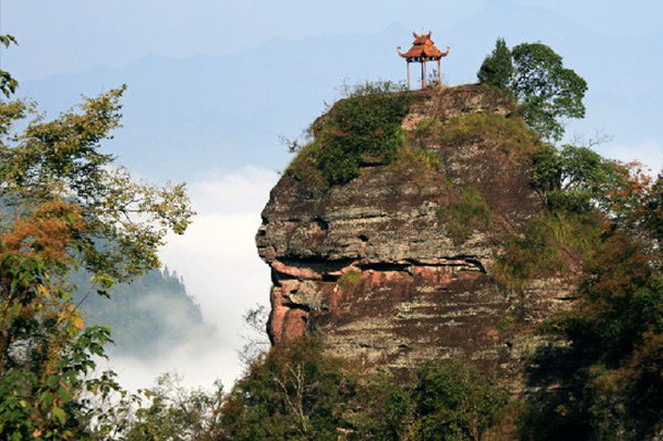 香爐亭,立于齊云山香爐峰巔,為鐵鑄風(fēng)景名亭。初鑄于1226年,造型玲瓏,制作精巧;亭內(nèi)還有巨型鐵香爐。亭與爐俱毀于1968年。1983年,齊云山管理處重建鐵亭,全部用鋼管鐵焊成,高2.6米,四柱翹角單層結(jié)構(gòu)。遠(yuǎn)眺,此亭似香爐峰一頂王冠!