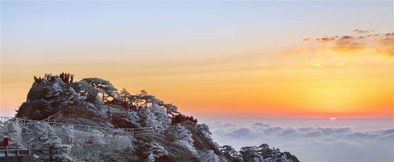 Mount Huangshan's climate is mild and humid, and the temperature is agreeable during all four seasons. In July, the summer's hottest month, the temperature falls between 70 and 80 °F. The white, billowy cloud cover alleviates sunrays, ensuring that guests to the mountain are always comfortable. The area lies in a subtropical zone, so winter months range from 25 °F to 40 °F—cold enough to result in unmatched snow scenery, but mild enough to enjoy outdoor activity in a world draped with icicles. Today, Huangshan Mountain has developed a world-famous reputation as a must-see tourist site. With its convenient facilities: three cable lines, four three-star hotels on the peak, and all the paths paved with flat stones, it lures millions of visitors, foreign and domestic. Seeing is believing.Welcome to Huangshan Mountain.