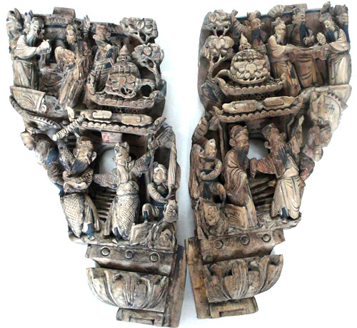 Wood carvings were often found on beams, pillars and their above brackets, upturned eaves, railings, doors, windows and such furniture as cupboards and tables. The application of tung oil instead of colorful paint exposed the natural texture of wood while at the same time protecting the carvings from corrosion.