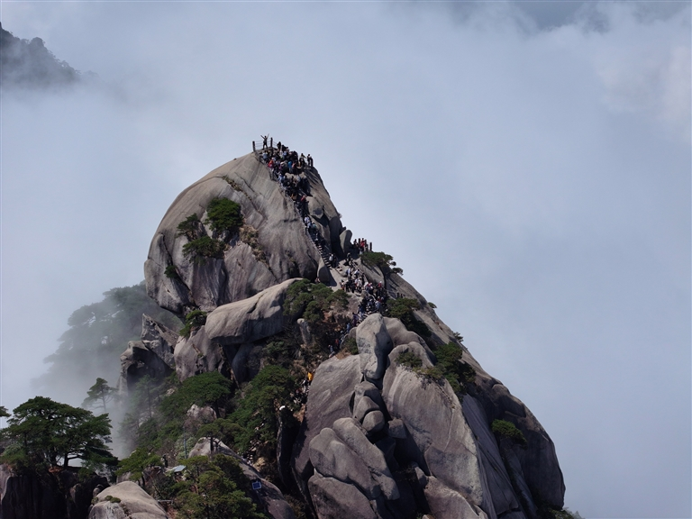 On April 23, tourists were seen hiking and taking in the magnificent views of Huangshan Mountain Scenic Area at Tiandu Peak. The renowned peak concluded its winter maintenance period and reopened to the public on this day, attracting numerous visitors eager to experience its steep terrain and majestic scenery.
