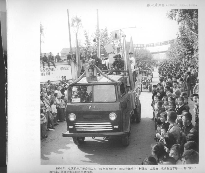 本年 屯溪機床廠革命職工在“15年趕超英美”的口號鼓舞下,樹雄心,立壯志,成功制造了唯一一部“黃山”牌汽車,并開上街頭向毛主席報喜。