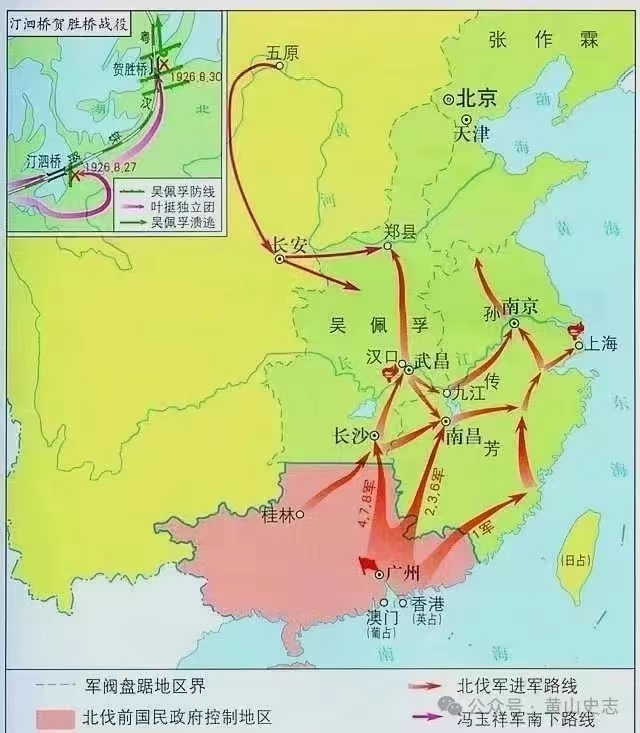 1926年7月,在中國共產(chǎn)黨的領(lǐng)導(dǎo)和推動下,國民革命軍在廣州興師北伐。經(jīng)過兩個多月的頻繁戰(zhàn)斗,至8月初打垮了直系軍閥吳佩孚、孫傳芳的主力,占領(lǐng)了長江中游的湖北、湖南和江西等省份。北伐軍在攻克武漢、南昌后,兵分3路繼續(xù)北伐,西路軍沿平漢鐵路北上,東路軍矛頭指向浙江,中路軍沿長江東進。