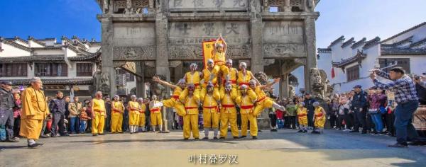 疊羅漢為流行于歙縣葉村的一種民間游藝。表演時(shí)演員下穿紅彩褲,上身赤膊光膀,面部繪有臉譜。演員均為男性,表演渾樸粗獷。演出前舉行祭臺(tái)儀式,焚紙燒香、羅漢掃堂,然后從演員相繼登臺(tái)或在廣場(chǎng)上表演。演員不說(shuō)不唱,在大鼓敲擊的簡(jiǎn)單節(jié)奏下,分別表演童子拜觀音、斜角旗、仙人橋、石猴出山、水簾洞、劉海戲金蟾等造型。