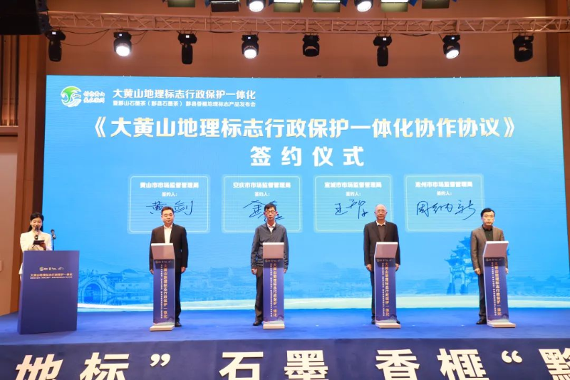 發(fā)布會(huì)上,黃山、池州、安慶、宣城四市市場監(jiān)管局共同簽署《大黃山地理標(biāo)志行政保護(hù)一體化協(xié)作協(xié)議》,啟動(dòng)跨區(qū)域地理標(biāo)志保護(hù)合作模式;發(fā)布《大黃山地理標(biāo)志保護(hù)名錄(第一批)》共16個(gè)地理標(biāo)志、《大黃山地理標(biāo)志專用標(biāo)志使用人重點(diǎn)商標(biāo)保護(hù)名錄》共20個(gè)商標(biāo),開啟重點(diǎn)領(lǐng)域、重點(diǎn)產(chǎn)業(yè)地理標(biāo)志協(xié)同保護(hù)序幕;邀請專家學(xué)者、地理標(biāo)志專用標(biāo)志用標(biāo)企業(yè)參與圓桌對話,共同探討地理標(biāo)志產(chǎn)品保護(hù)賦能鄉(xiāng)村振興;考察黟山石墨茶(黟縣石墨茶)、黟縣香榧地理標(biāo)志保護(hù)產(chǎn)品生產(chǎn)基地,舉辦大黃山地標(biāo)市集,聯(lián)合宣傳推介大黃山地理標(biāo)志產(chǎn)品。