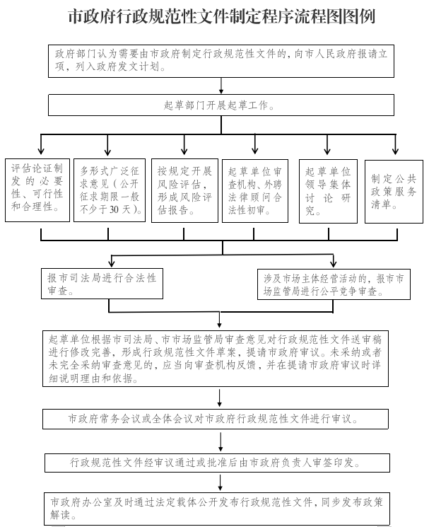 第二部分 制定,共19條(第四條—第二十二條),主要明確行政規(guī)范性文件的制定主體、發(fā)文立項、組織起草、文件簽署、公開發(fā)布、施行、解釋等重要制度,并就公平競爭審查、合法性審查、集體審議等行政規(guī)范性文件的制定程序以及簡化程序的情形進(jìn)行了詳細(xì)規(guī)定(附“市政府行政規(guī)范性文件制定程序流程圖圖例”)。