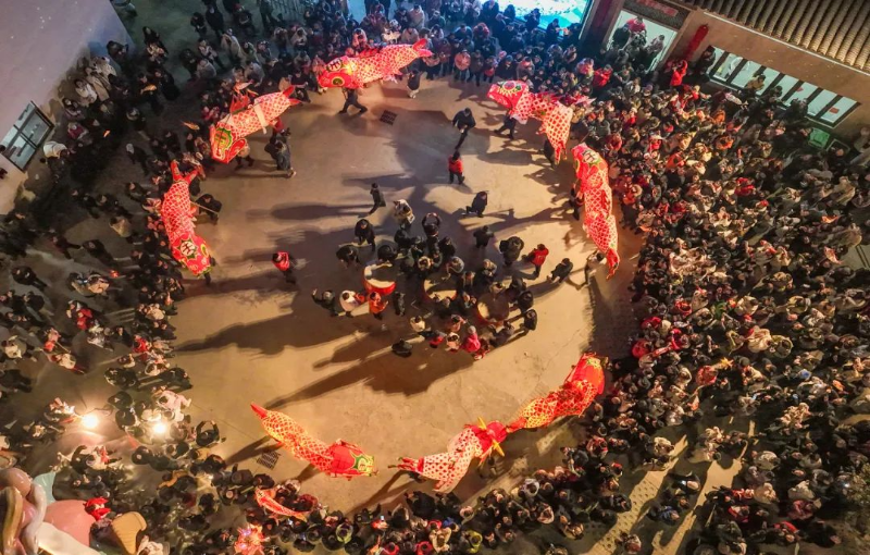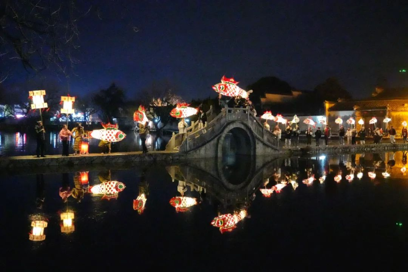 2月10日,歙縣北岸鎮(zhèn)瞻淇村,村民舞魚燈,鬧元宵,與游客共歡樂,祈福美好。·鄭宏·