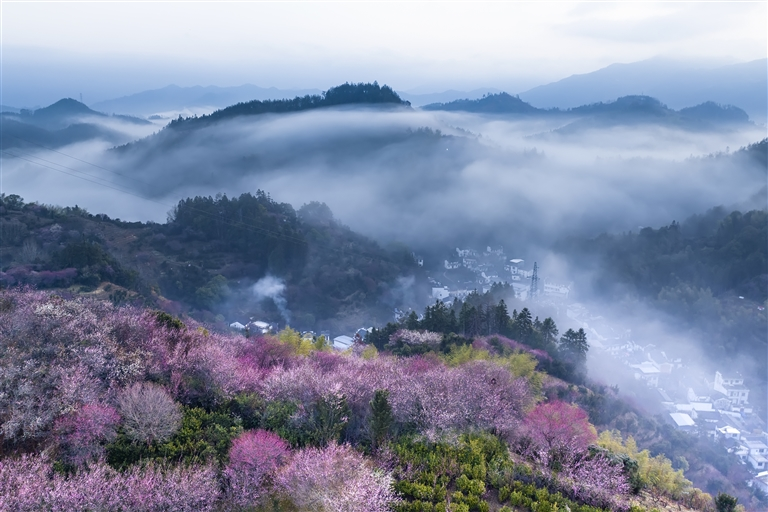 2月16日,在歙縣雄村鎮(zhèn)賣花漁村,漫山遍野綻放的梅花與徽派村落民居相映成趣,景美如畫,吸引眾多市民游客前來賞花觀景。