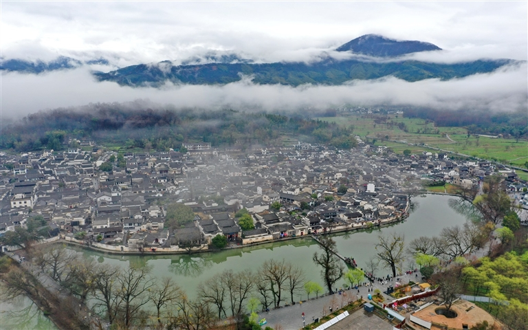 當(dāng)日,宏村煙雨朦朧,云海翻涌,遠(yuǎn)處的山巒在云海中若隱若現(xiàn),整個(gè)畫面充滿了詩意和美感,引得游客們流連忘返。