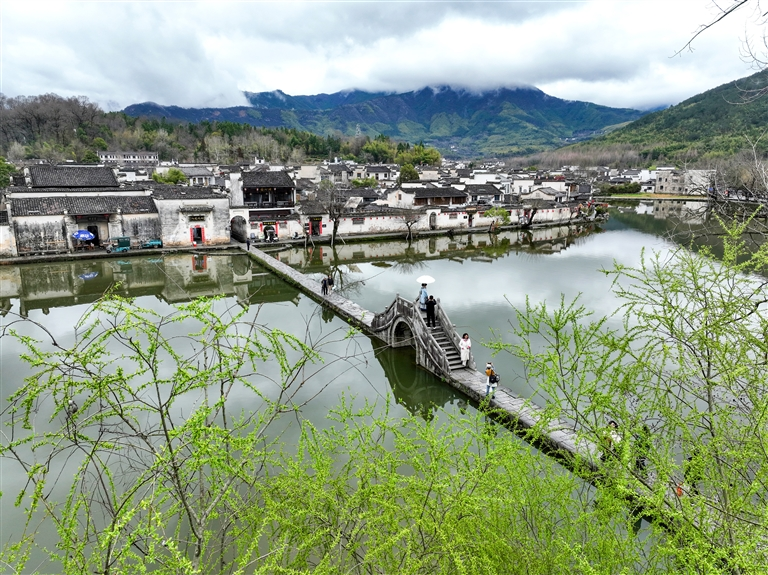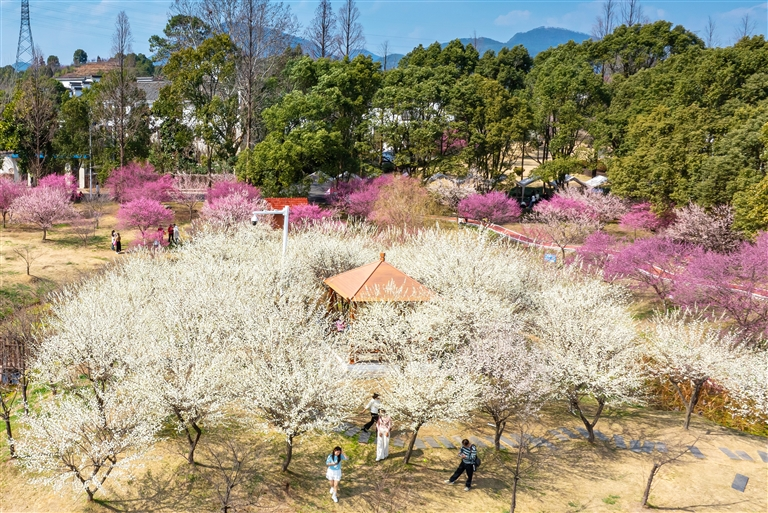 古村落在云霧與新綠間若隱若現(xiàn);白玉蘭在老墻旁悄然綻放;河畔櫻花與綠水、行舟相映成趣;茶園里,嫩綠的茶芽與粉色花朵相互依偎,清新的茶香與花香混合在一起,讓人心曠神怡。