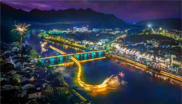 “為了提升游客的在地體驗(yàn)感,我們?cè)趲r腳村江畔策劃推出“橫江舞金龍”旅游項(xiàng)目,將幾十艘長(zhǎng)度200多米的竹筏首尾相連,組成‘金色龍舟’在橫江游弋,恢宏的氣勢(shì)、喜慶的場(chǎng)面,成為眾多游客心目中的中國(guó)式浪漫。”齊云山生態(tài)旅游度假區(qū)負(fù)責(zé)同志介紹。