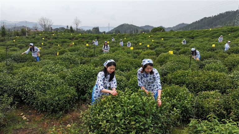 圖為采茶姑娘正在茶園內采摘新茶。 樊成柱/攝